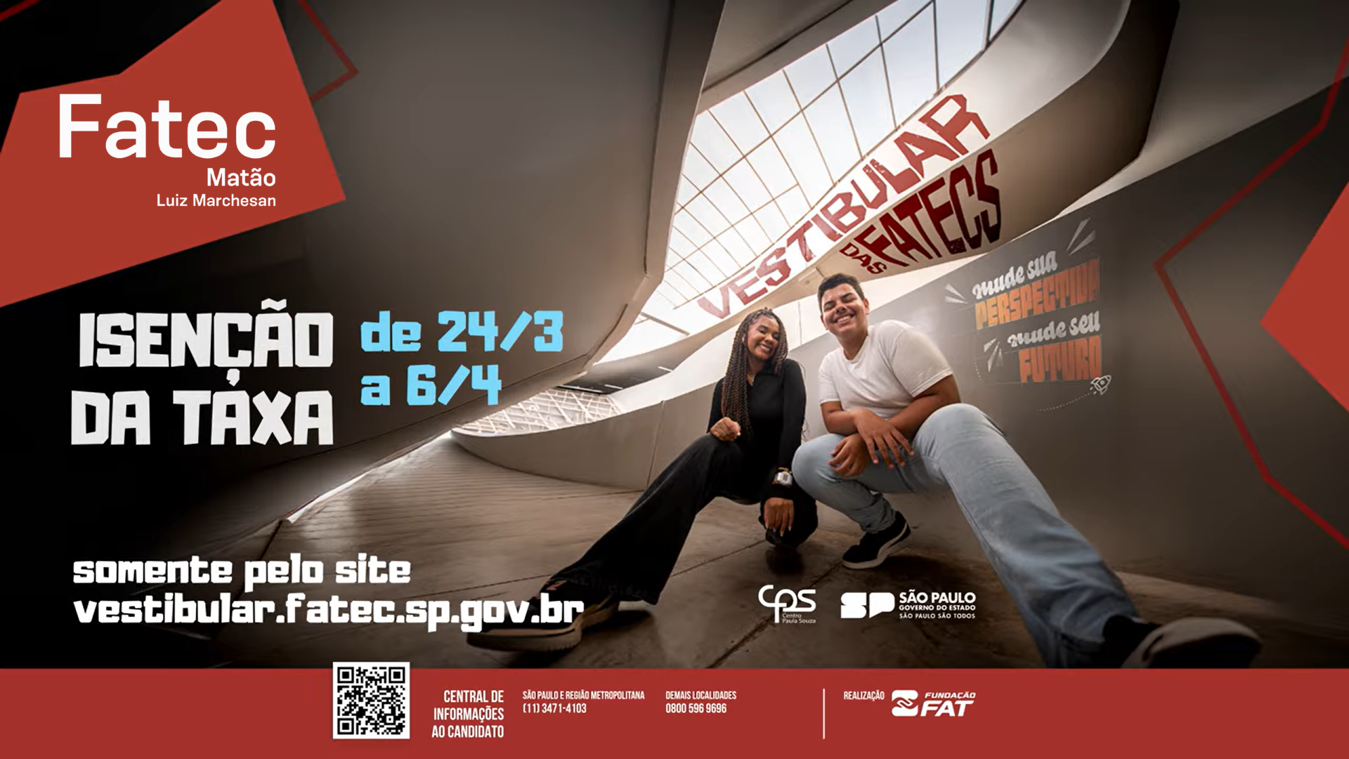 De 24 de março a 06 de abril de 2026, estará aberto o período para solicitação de isenção ou redução da taxa de inscrição do Vestibular do 2º semestre de 2026 da Fatec Matão – Luiz Marchesan.