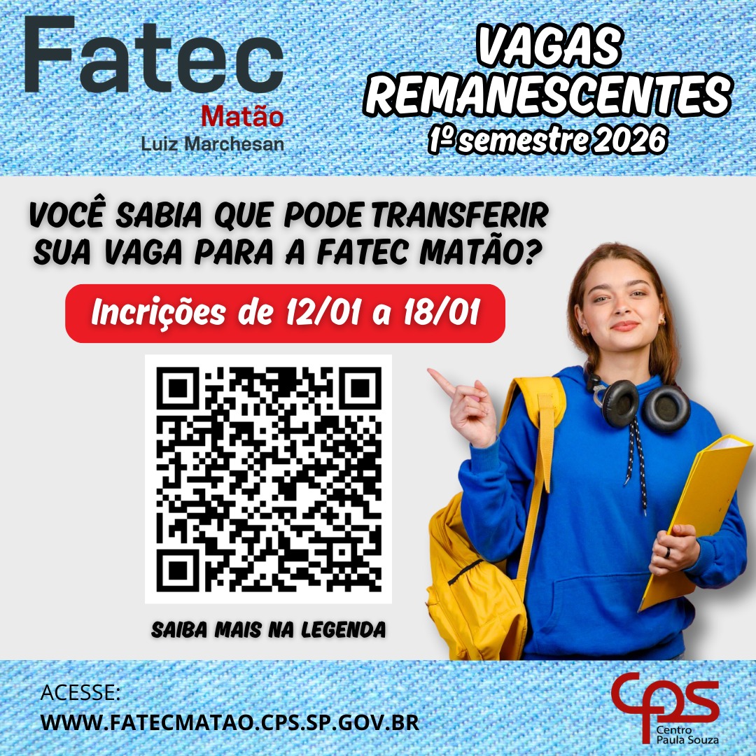 A partir do dia 12 de janeiro até o dia 18 de janeiro de 2026, estão abertas as vagas remanescentes para os cursos de Análise de Processos Agroindustriais e Desenvolvimento de Software Multiplataforma, conforme edital abaixo.